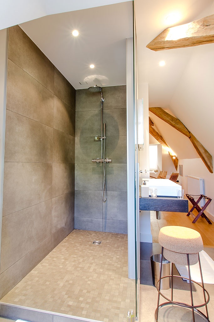 In the large bathroom, you will enjoy the italian style shower while admiring the nearby Bell Tower of the Church Saint Martial, Gothic construction of the late 15th century.